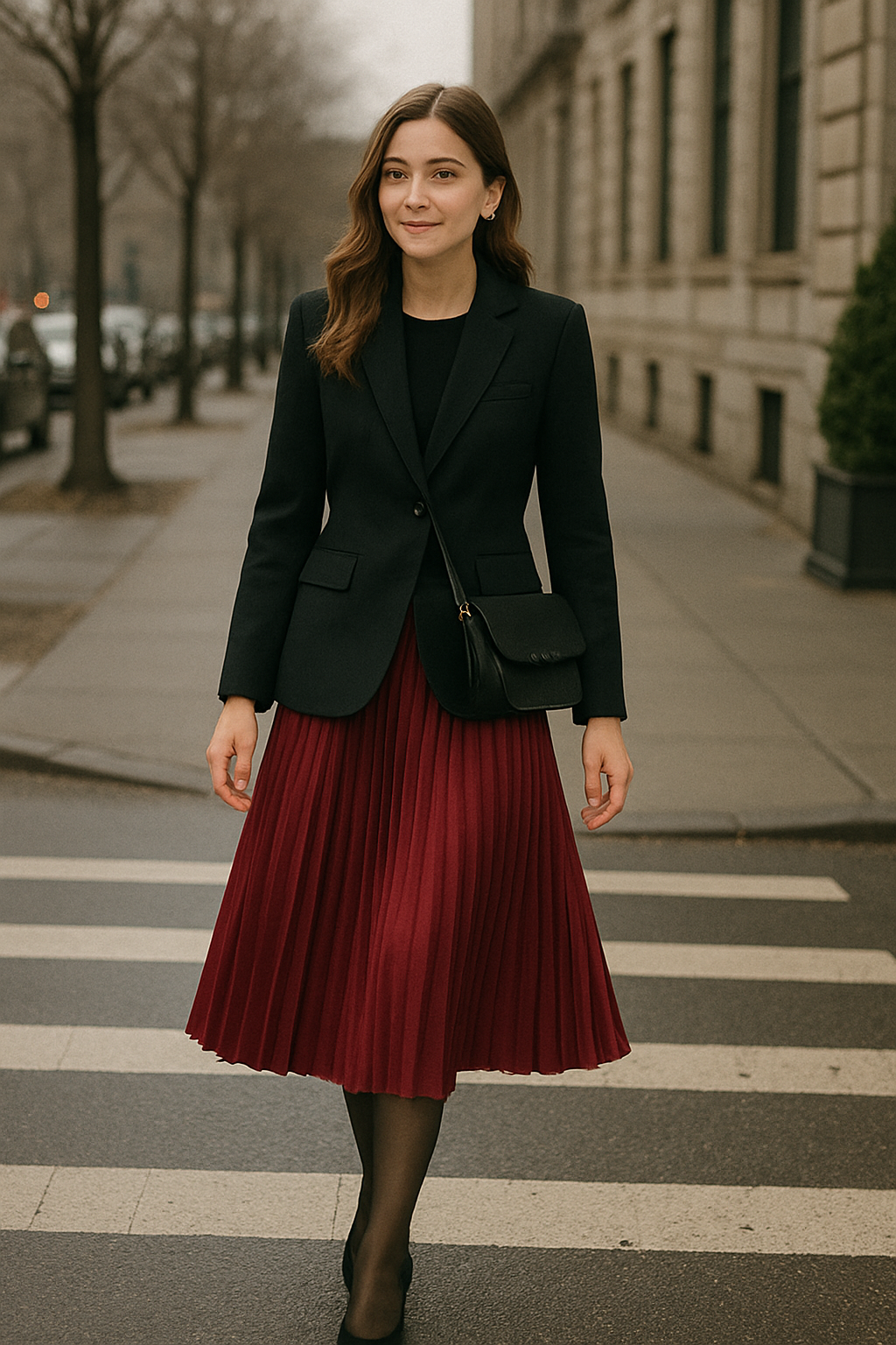 A structured blazer gives this outfit professional polish while the pleated skirt in emerald, sapphire, or ruby tones brings depth and richness.