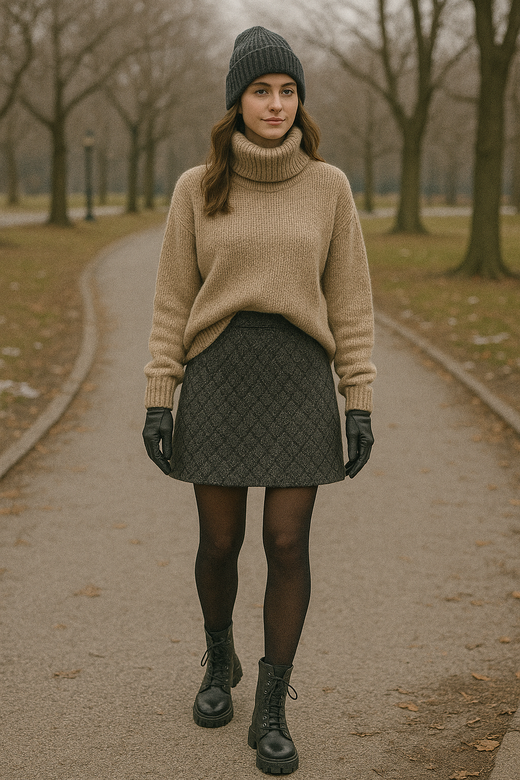 3. Oversized Turtleneck + Textured Skirt + Lug-Sole Boots