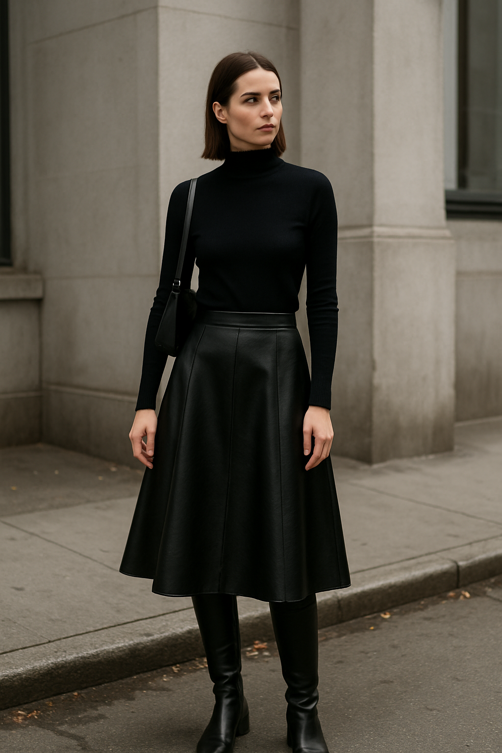 4. Slim Mock-Neck Top + Leather A-Line Skirt + Knee-High Boots