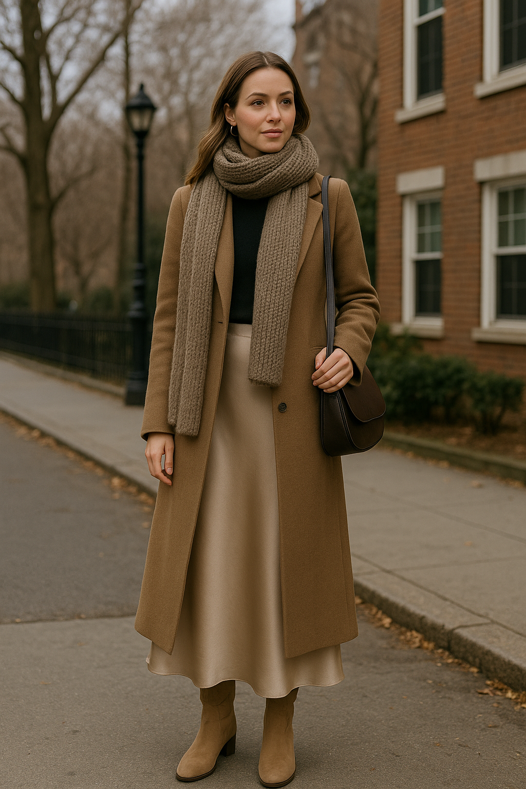 5. Longline Coat + Satin Bias-Cut Skirt + Chunky Scarf