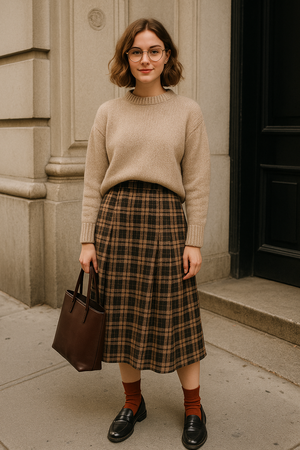 6. Cropped Sweater + High-Waisted Plaid Midi + Loafers with Socks