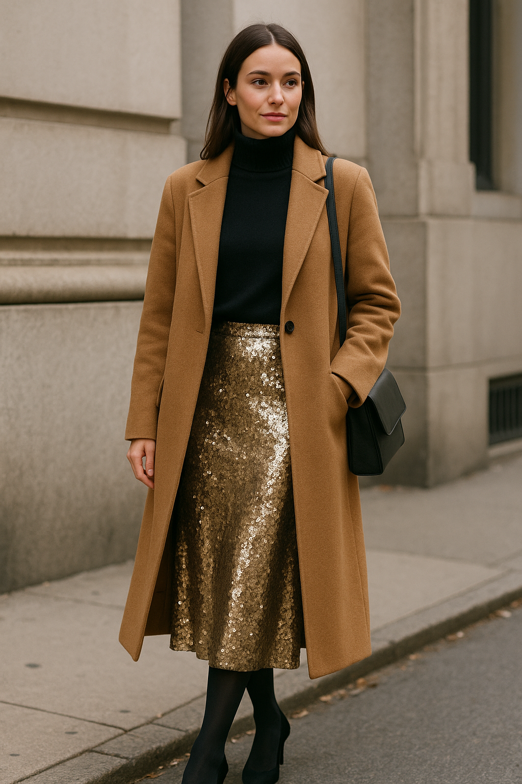 Your fitted turtleneck provides a sleek, neutral backdrop that lets the sequins shine without overwhelming your look. A simple wool coat in camel, gray, or black tones down the glamour just enough for daytime wear while keeping you warm.