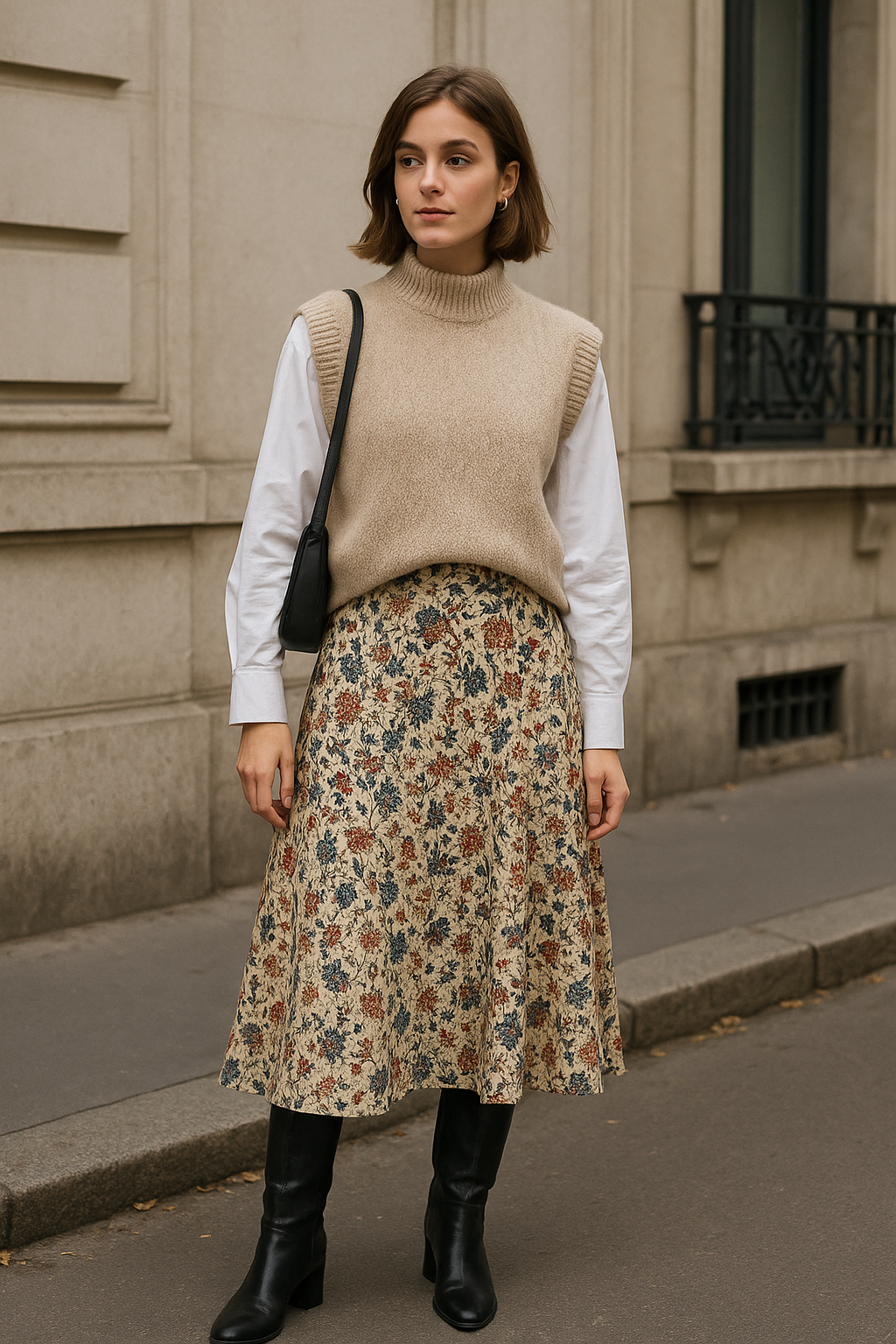 8. Boxy Knit Vest Over Shirt + Printed Midi Skirt + Heeled Ankle Boots