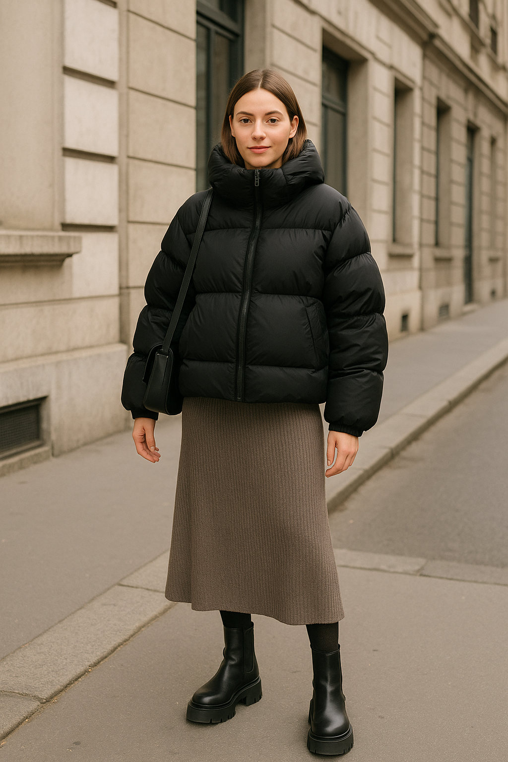 Puffer jackets have become high-fashion staples, and they look especially cool paired with unexpected pieces like knit skirts.