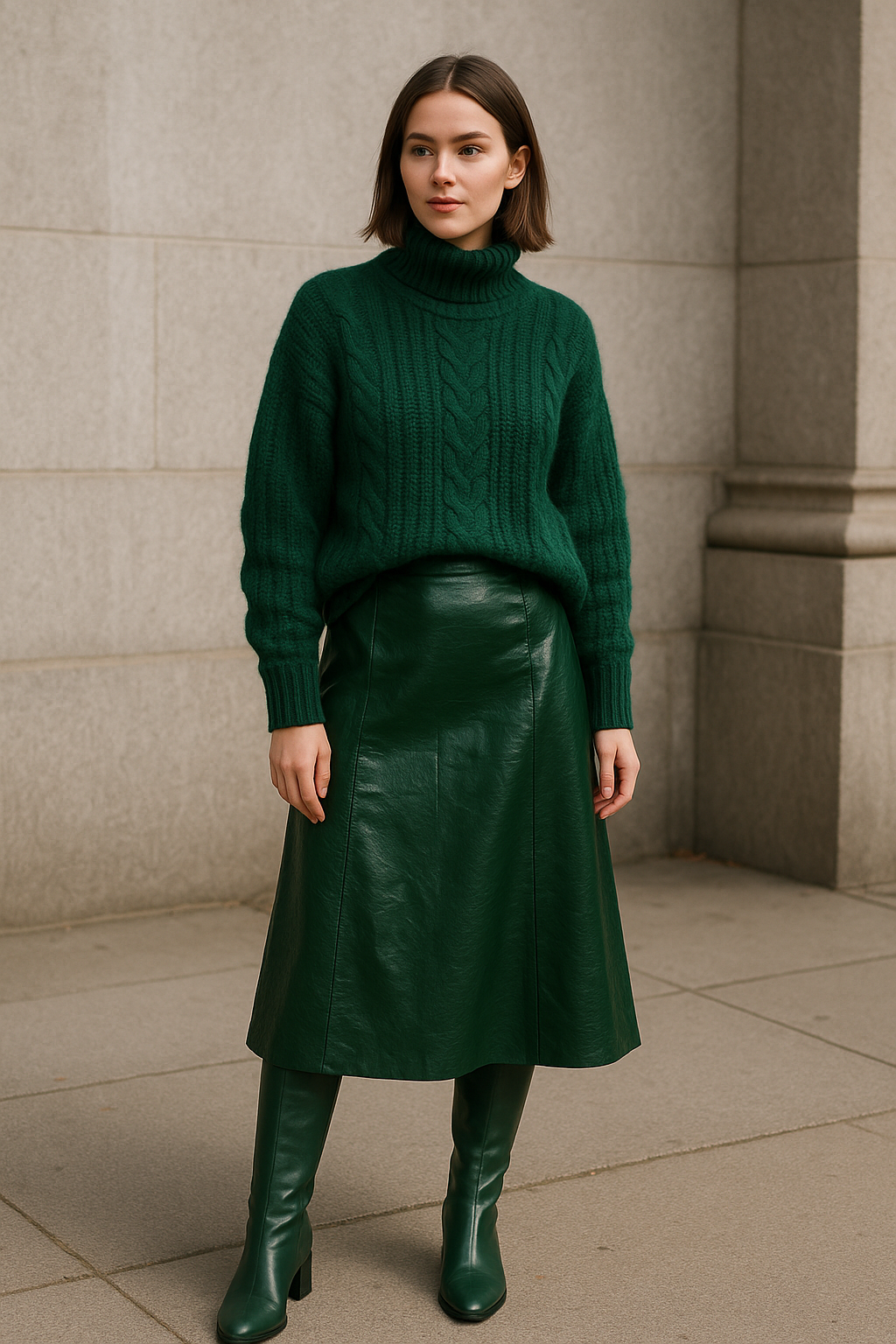 10. Monochrome Winter Look: Same-Color Sweater + Statement Skirt in Bold Material