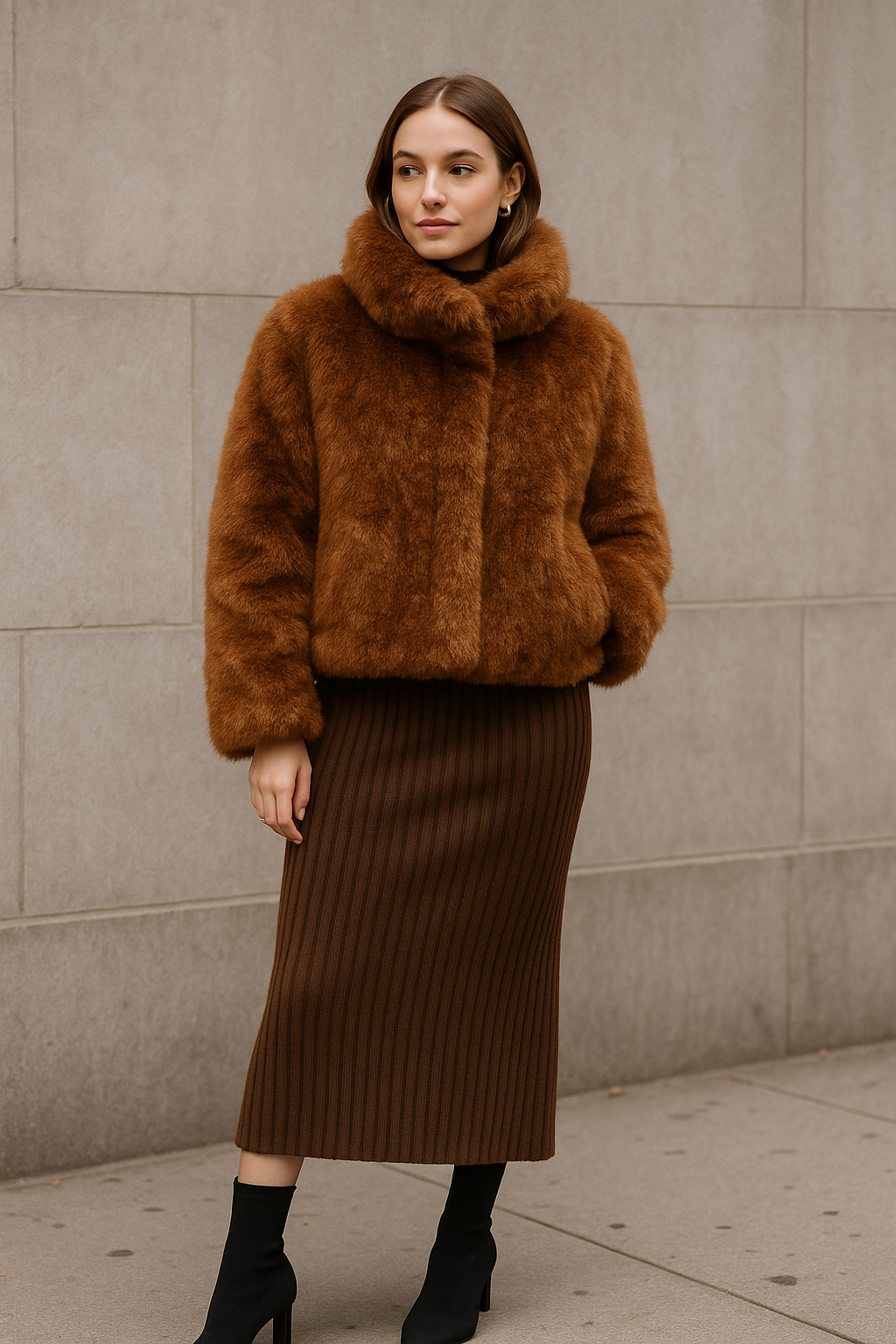 11. Faux-Fur Jacket + Ribbed Knit Skirt + Sleek Sock Boots