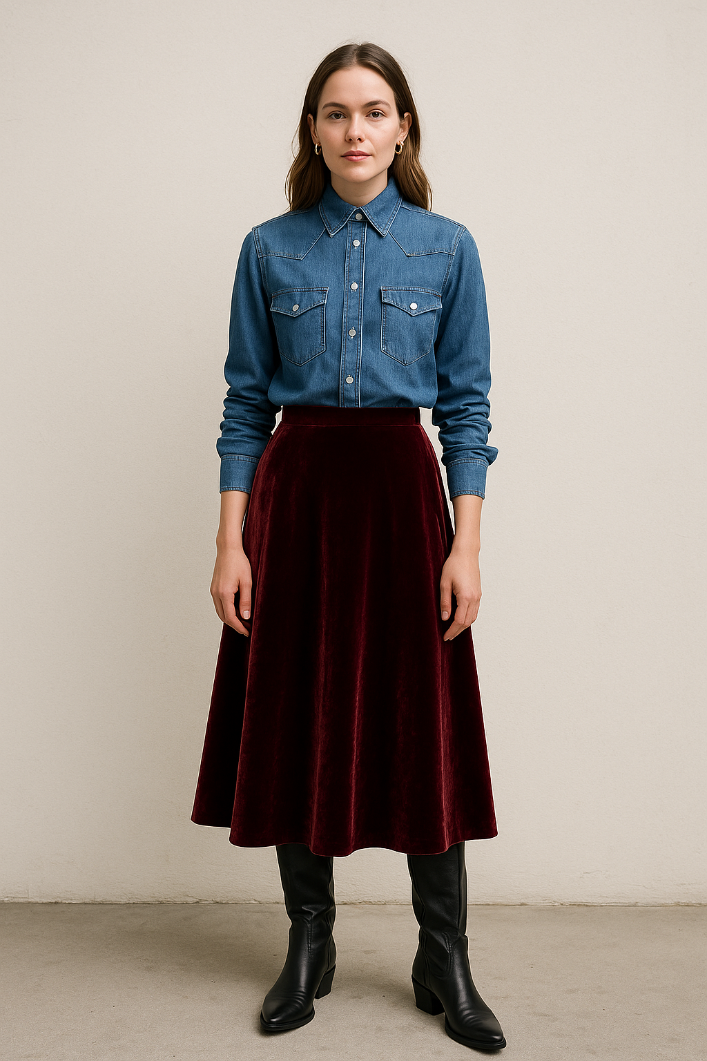 12. Denim Shirt Buttoned to Collar + Velvet Midi Skirt + Western-Style Boots