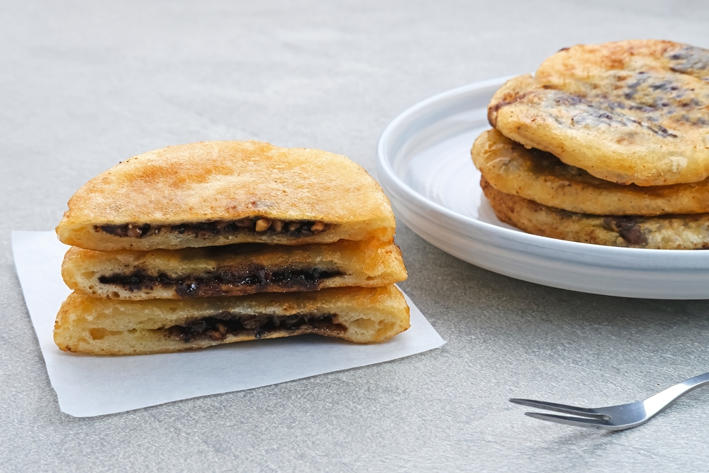 These stuffed pancakes have a crispy exterior that gives way to a gooey center filled with brown sugar, cinnamon, and chopped nuts.