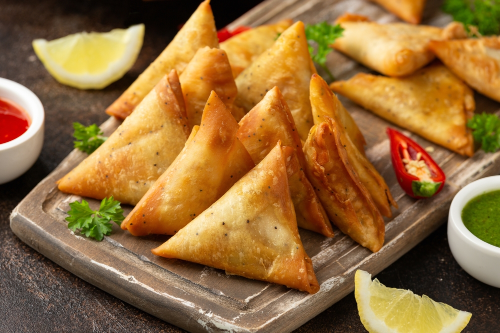 These crispy triangular pastries filled with spiced potatoes and peas bring authentic Indian flavors to your table.