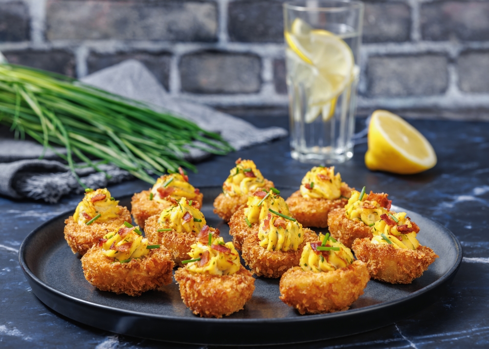 You start with traditional deviled eggs, then coat them in breadcrumbs and fry until golden.