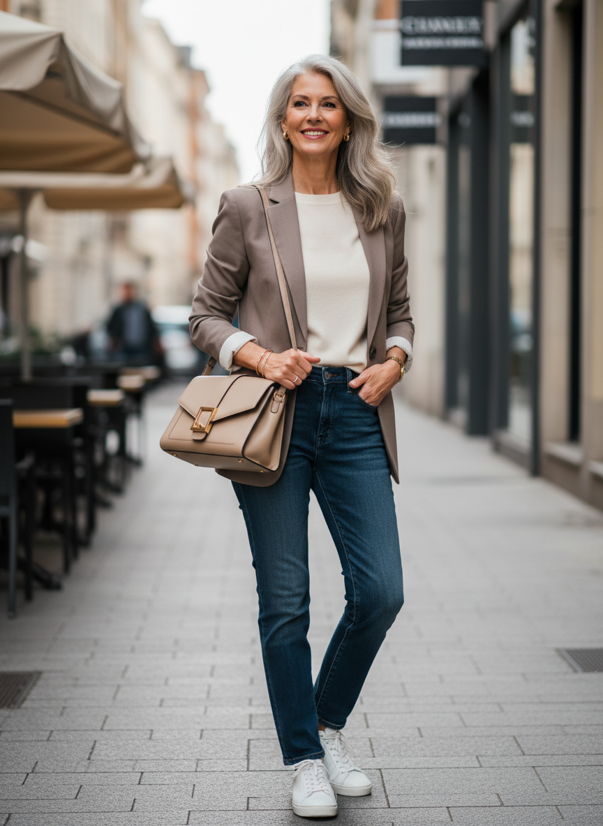 1. Straight-Leg Jeans + Soft Knit Top + Structured Blazer + Low-Profile Sneakers