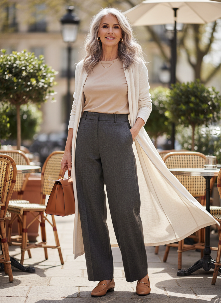 2. Ankle-Length Wide-Leg Trousers + Fitted Tee + Lightweight Duster + Loafers