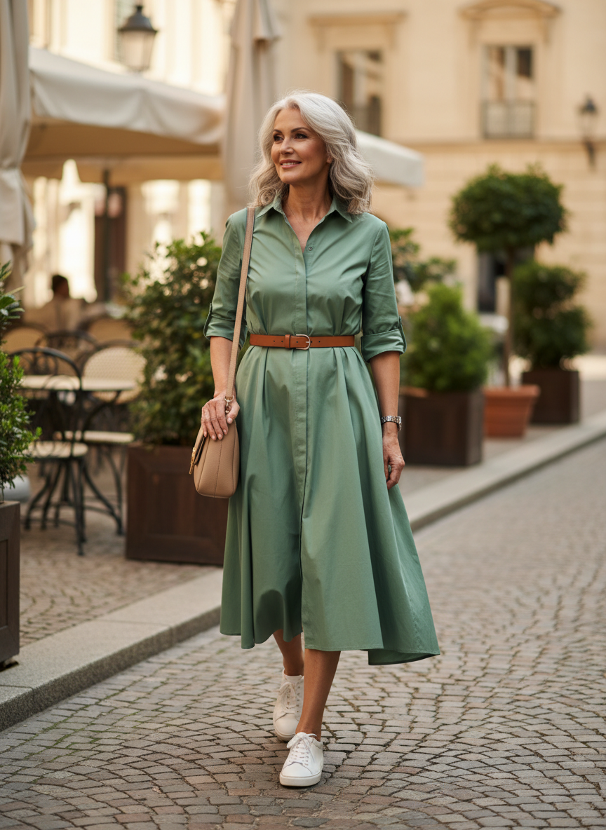 3. Midi Shirt Dress + Leather Belt + Flat Sandals or Sleek Trainers