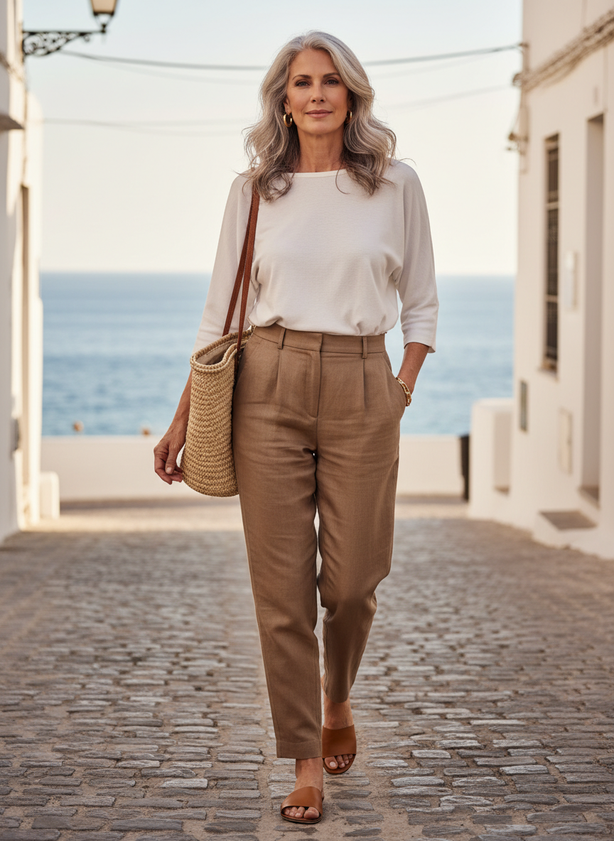 Linen pants in earthy neutrals create a relaxed yet refined look that never appears sloppy or unkempt.
