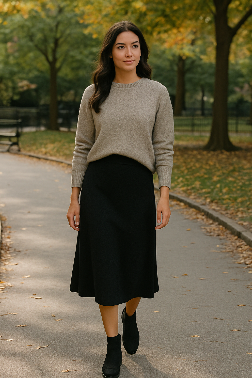 A skirt paired with a cozy sweater strikes that perfect balance between feminine and comfortable.