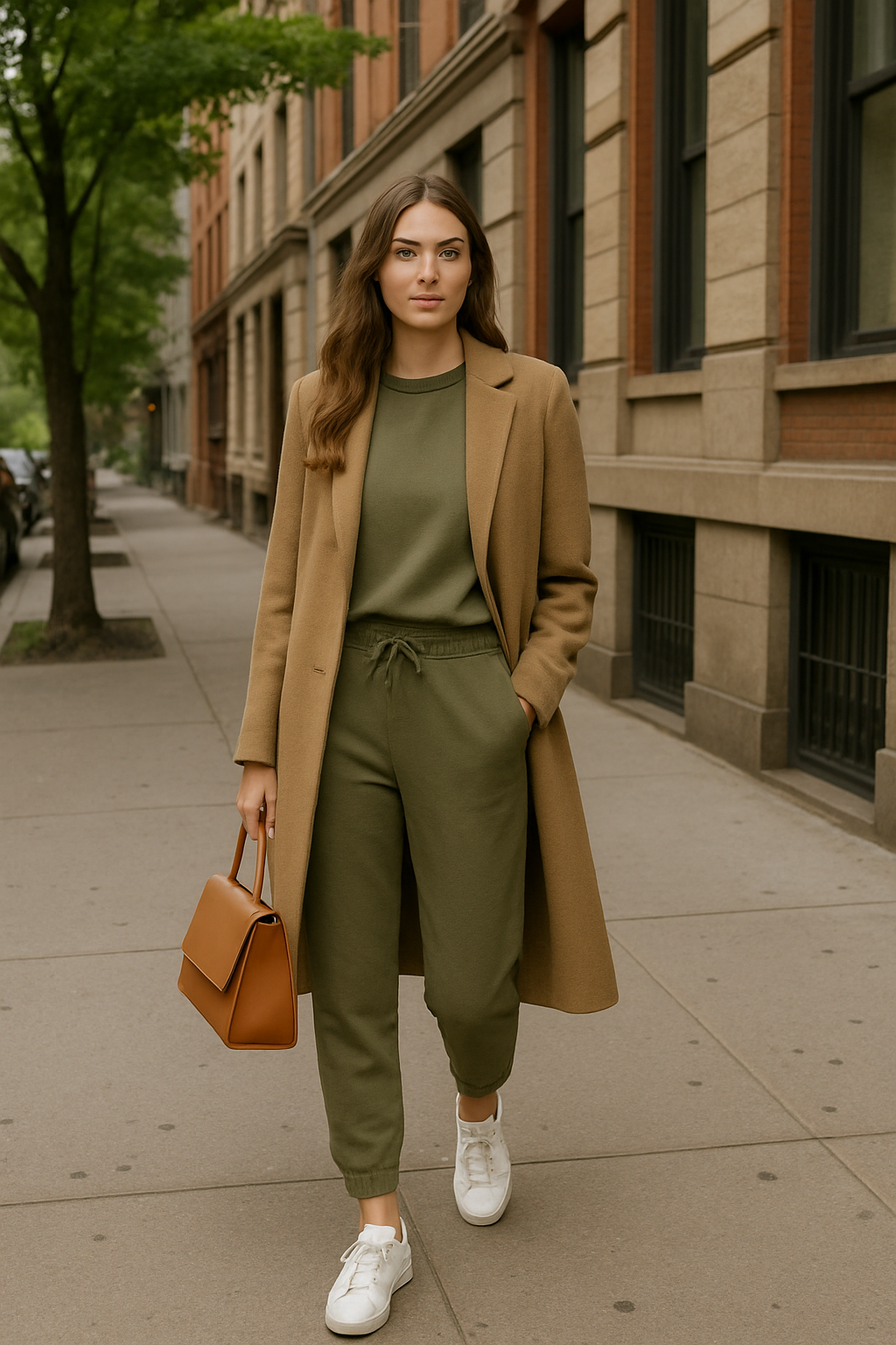 This look is incredibly comfortable for long days while still appearing intentional and fashion-forward.