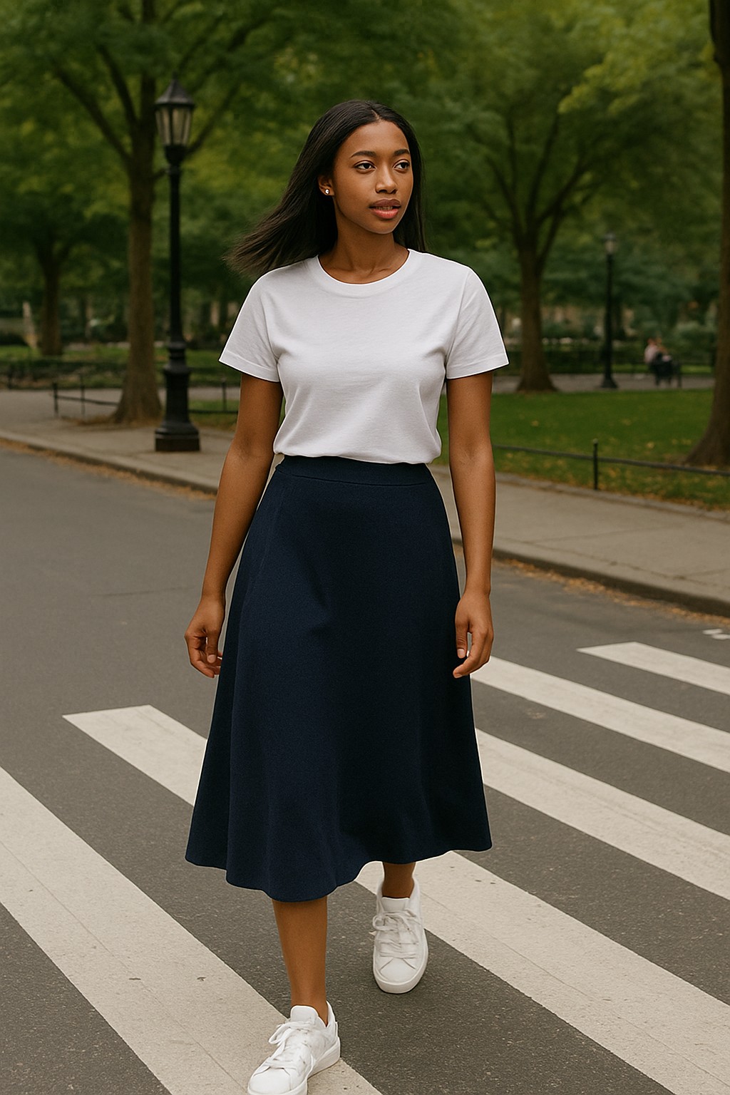 Skirts might seem fancier than pants, but a midi skirt is actually one of the easiest pieces to style when you’re short on time.