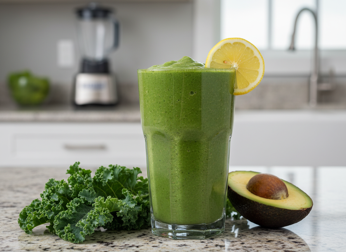 Start with a handful of kale, half an avocado, one banana for sweetness, and your choice of liquid like almond milk or coconut water.