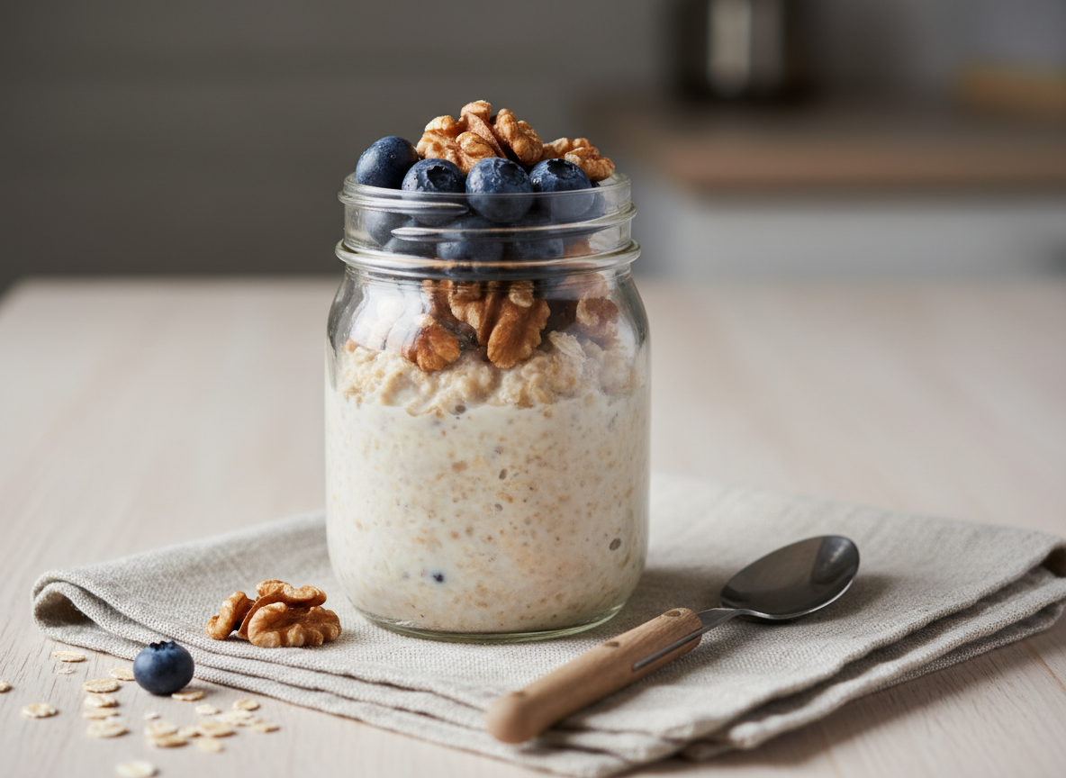 Combine rolled oats with milk or a dairy alternative in a jar, then add a handful of walnuts and blueberries.