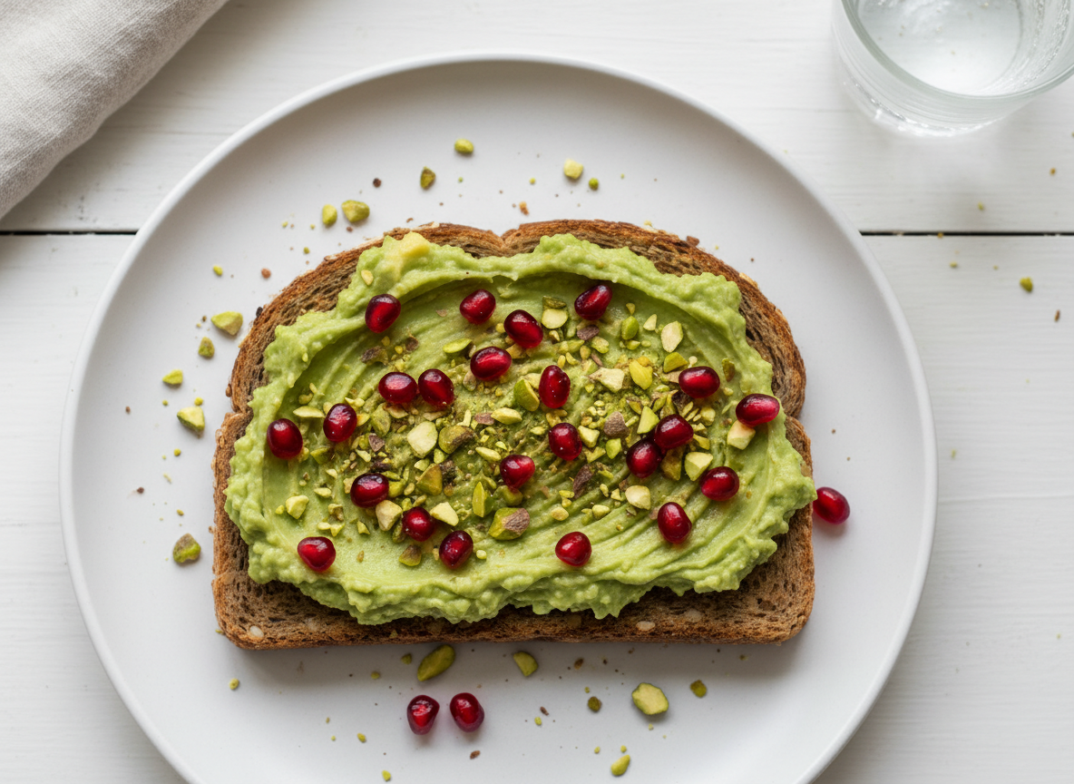 Mash half an avocado with a fork, spread it generously on the toast, and sprinkle with crushed pistachios and pomegranate seeds.