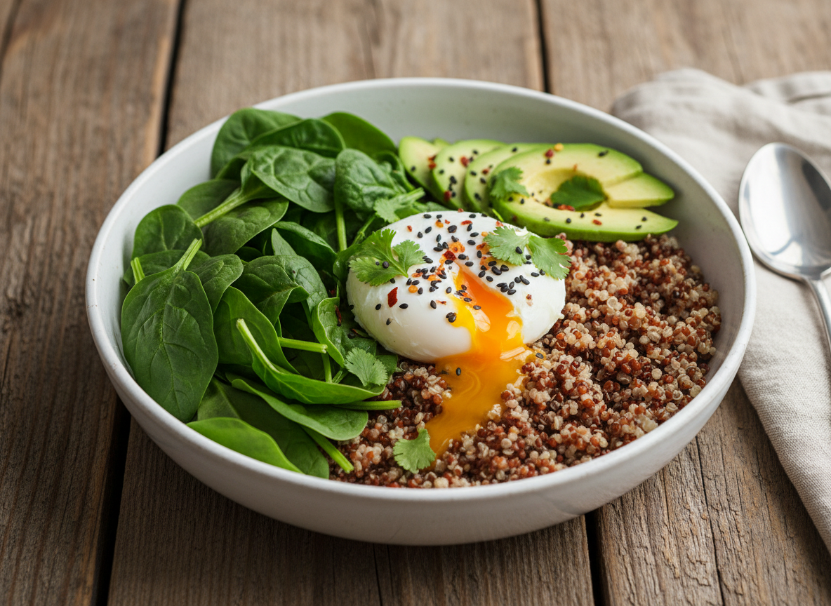 8. Quinoa Breakfast Bowl with Spinach, Avocado, and Poached Egg