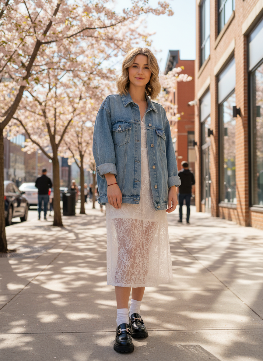 1. Oversized Denim Jacket + Sheer Lace Midi Dress + Chunky Loafers