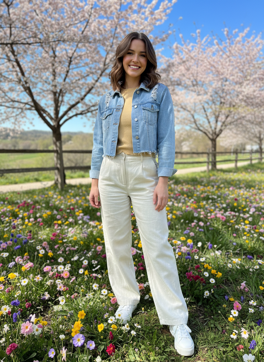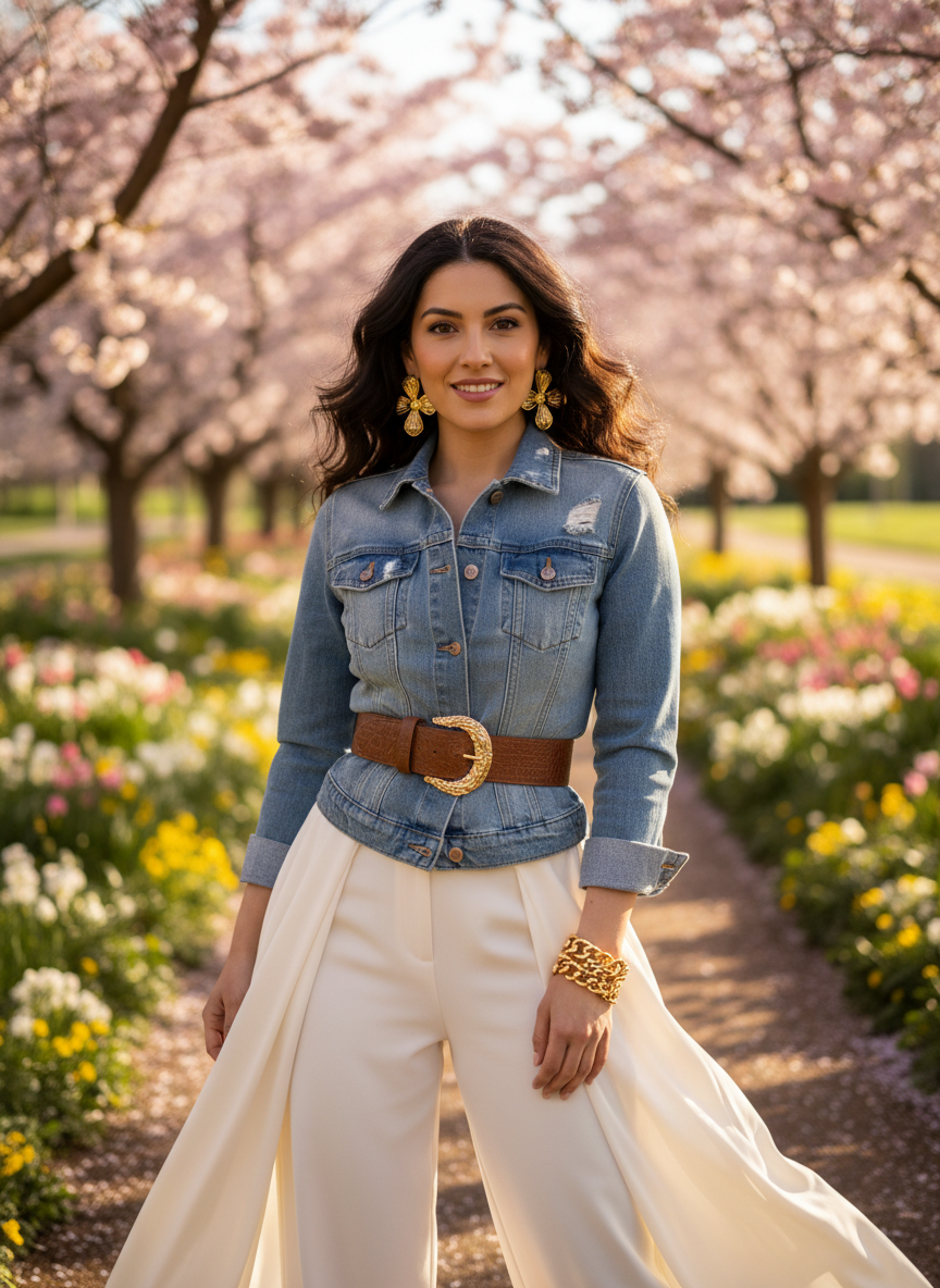 A fitted denim jacket that is cinched at the waist — either with a belt or by choosing a style with a defined cut — creates an hourglass shape that pairs beautifully with wide-leg trousers.