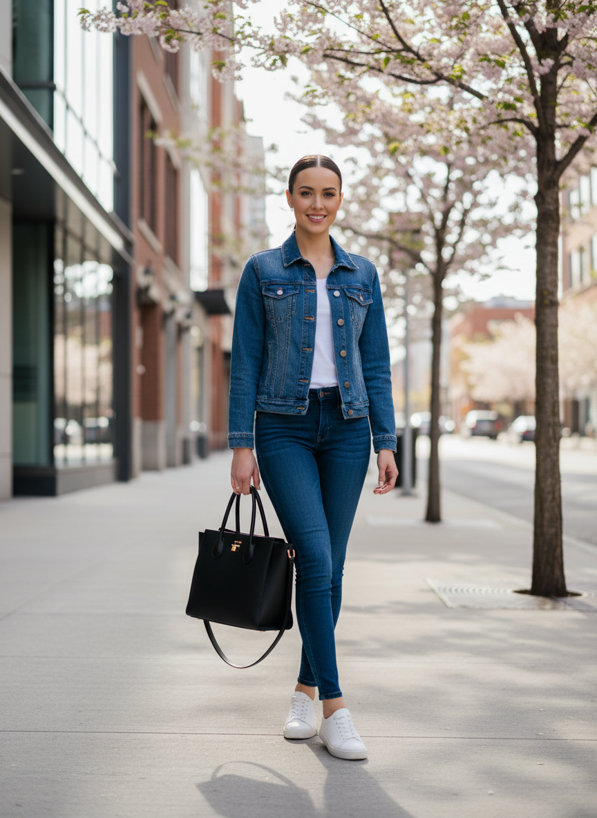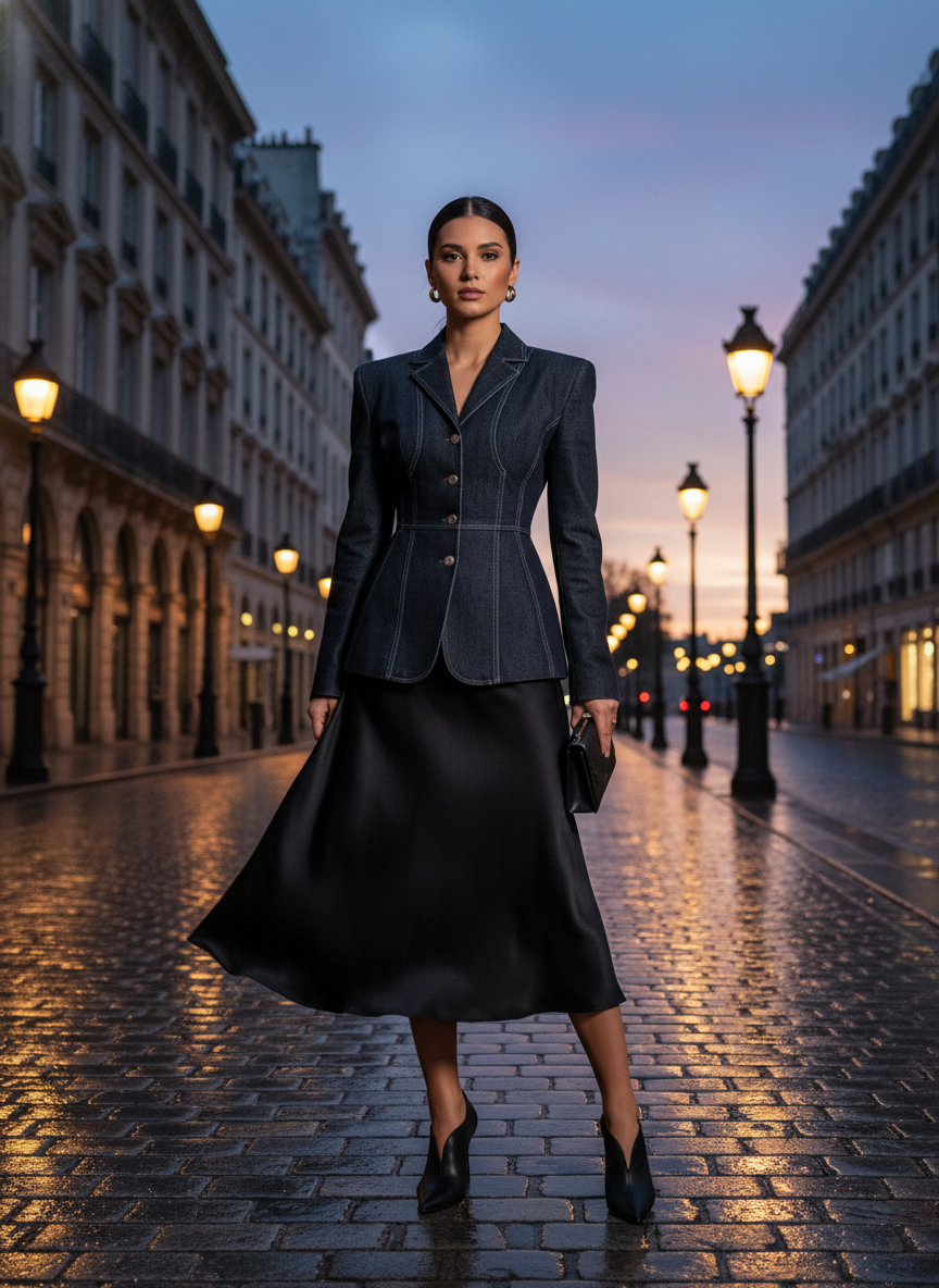 This outfit proves that denim can be every bit as sculpted and deliberate as any tailored blazer.