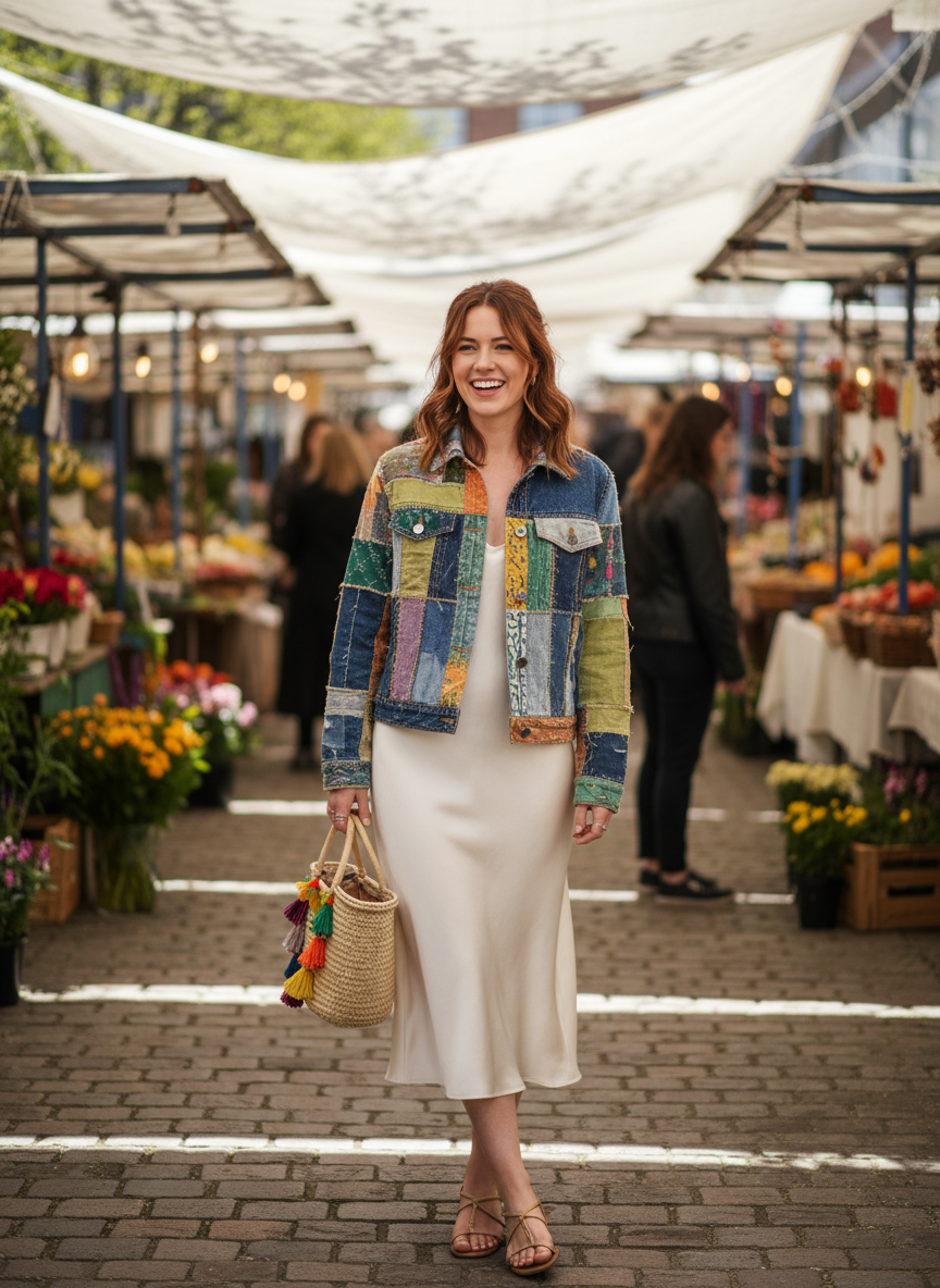 4. Patchwork Denim Jacket + Minimalist Slip Dress + Barely-There Sandals