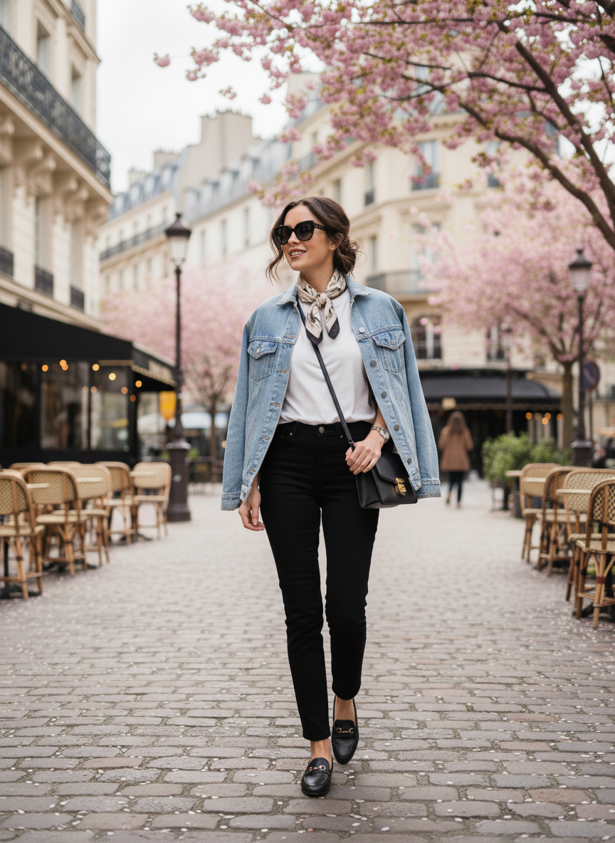 Tailored cigarette jeans keep the silhouette sleek and refined, while a silk scarf tied at the neck adds a touch of old-school European charm.