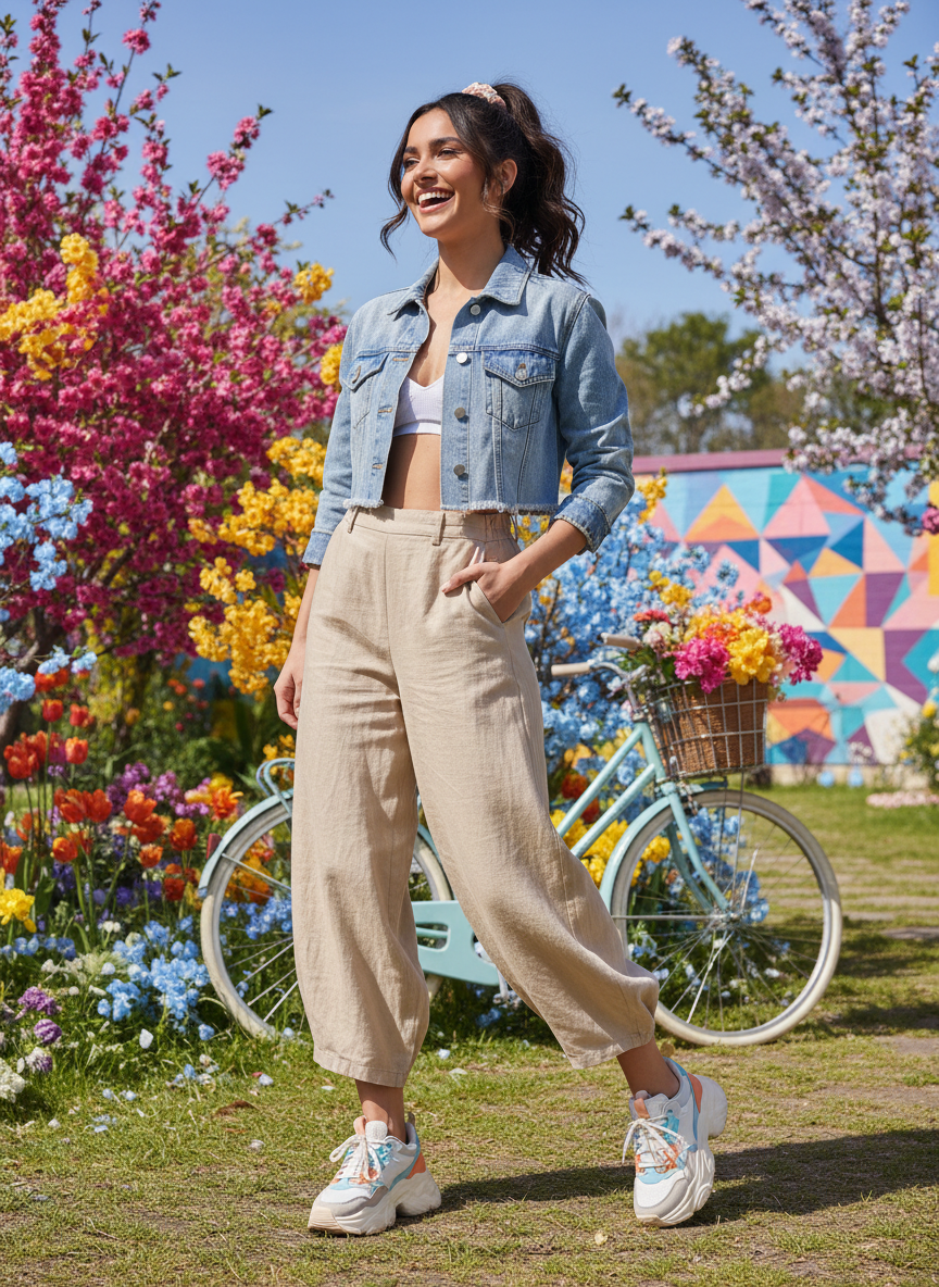 A cropped denim jacket paired with balloon pants creates a look that is bold, bouncy, and full of personality.