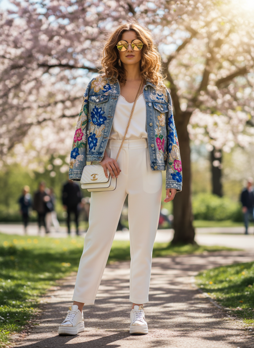9. Embellished Denim Jacket + All-White Base + Statement Sunglasses