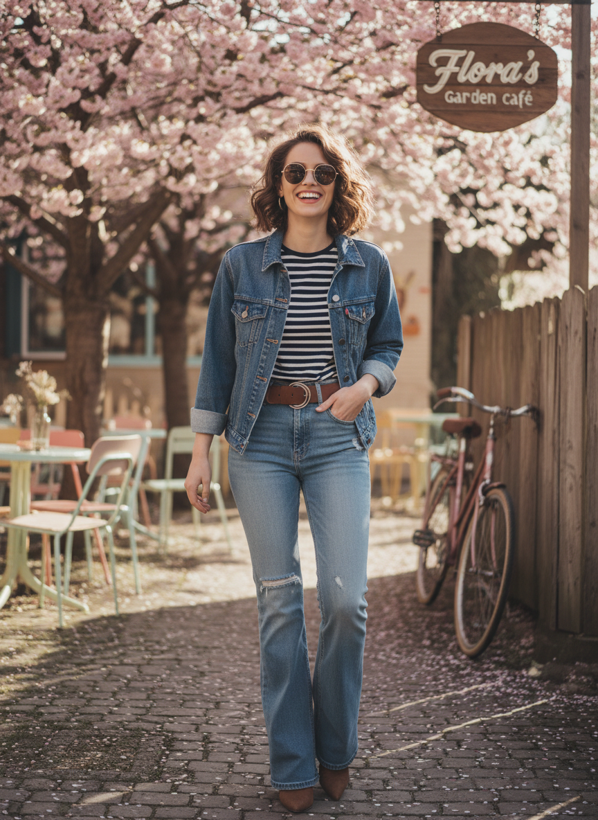 A striped shirt layered under a denim jacket, tucked into flare jeans, is a nod to that groovy decade — but cleaner, sharper, and more modern.