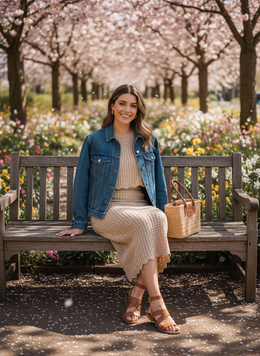 Layering a denim jacket over a crochet or knit co-ord set adds structure to an otherwise soft, textural look.